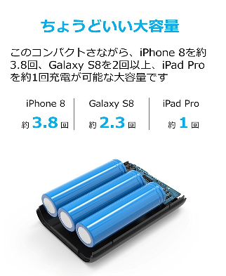 iPhone 6sに5回以上、Galaxy S6に3回、iPad Air 2に1回の充電が可能。